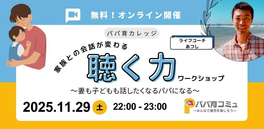 今回ご紹介するのは、家族との会話をやさしく変える60分のオンラインワークショップ「聴く力ワークショップ〜妻も子どもも話したくなるパパになる〜」です。
