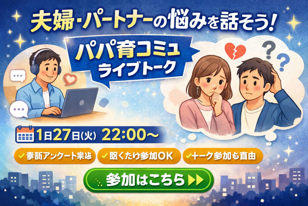 今回は、パパ育コミュ内のオープンチャット**「夫婦やパートナーなどの話」**にて開催される、参加型ライブトークイベントのお知らせです。