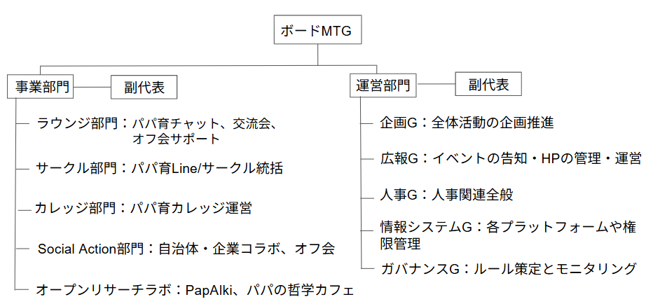 仕事と育児の合間に運営できるように権限と責任の移譲をした上でガバナンスを効かせ組織的に運営するように工夫しています。